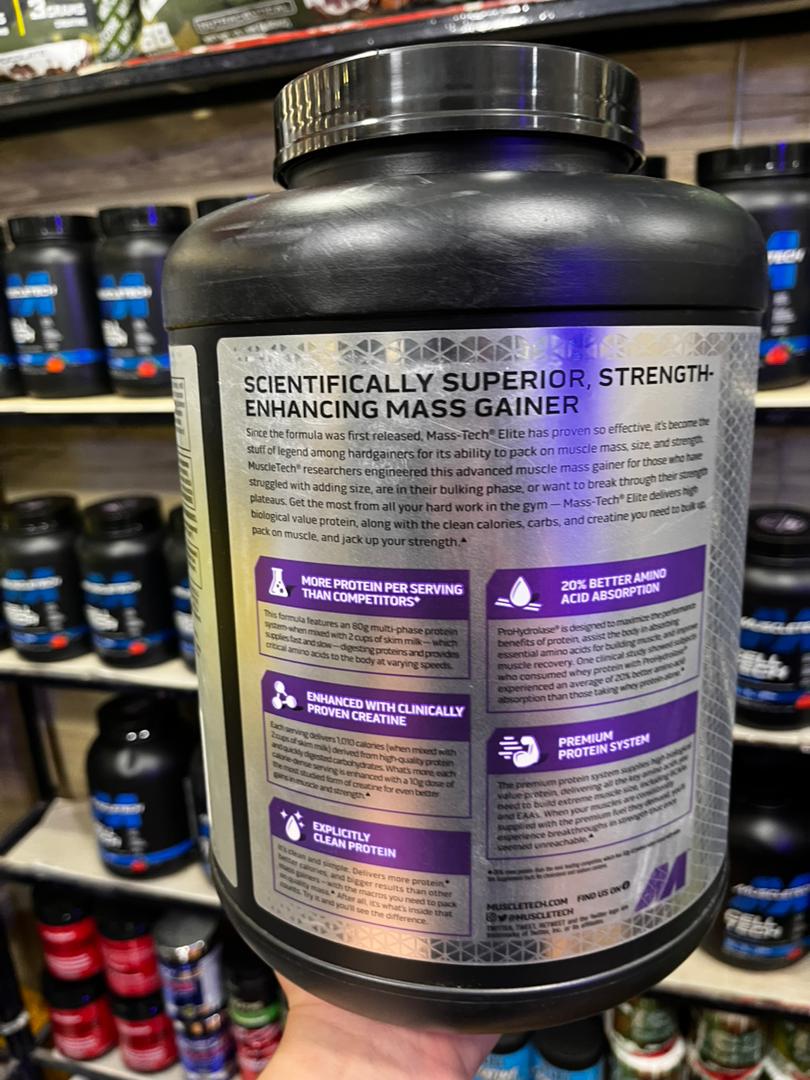 مس تک الیت ماسل تک Muscletech Mass-Tech Elite، یک افزایش دهنده توده عضلانی پیشرفته برای کسانی است که با افزایش سایز دست و پنجه نرم کرده اند، در مرحله حجیم شدن خود هستند یا می خواهند از فلات قدرت خود عبور کنند. همچنین این محصول بینظیر، برای به حداکثر رساندن مزایای عملکرد پروتئینی طراحی شده است که به بدن در جذب EAAs برای ساخت عضله و بهبود ریکاوری عضلات کمک می کند.