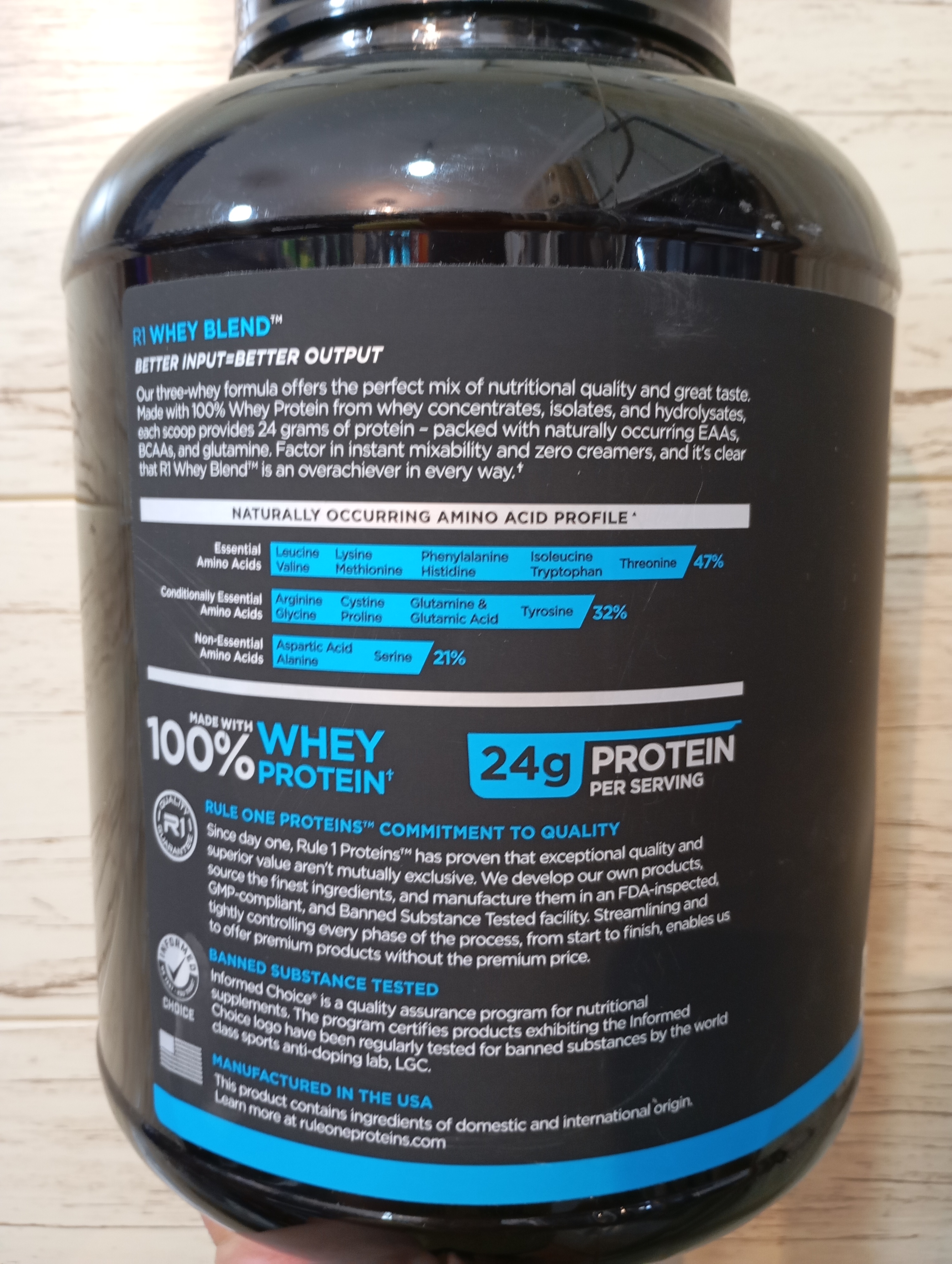 پروتئین وی رول وان، برای مصرف در شروع روز، قبل از تمرین یا بلافاصله بعد از تمرین، بین وعدههای غذایی یا به عنوان یک میان وعده مناسب است. این محصول برای اطمینان از کیفیت آن در مراکز ایالات متحدهی آمریکا، تولید میشود. پروتئین Rule One حاوی آمینواسیدهای ضروری است که برای ریکاوری و ترمیم عضلات مهم هستند. این محصول حاوی آمینو اسیدهای ضروری و پروتئین با کیفیت بالا، 24 گرم پروتئین وی صد در صد از کنستانتره وی ایزوله و هیدرولیزه با ای ای ایها و بی سی ای ایها و گلوتامین است.